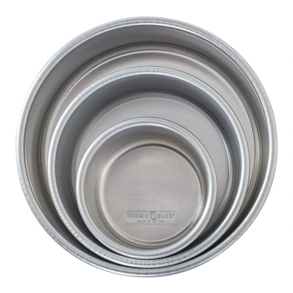Featuring round aluminum cake pans in three sizes, this Nordic Ware celebration set makes it easy to bake impressive layer cakes for special occasions. Made of cast aluminum with warp-resistant rims, these 4-inch, 6-inch and 8-inch pans can be used individually or coordinated to create tiered cakes for weddings, birthdays and holidays. Family-owned since 1946, Nordic Ware is world famous for their traditional Scandinavian-style bakeware.