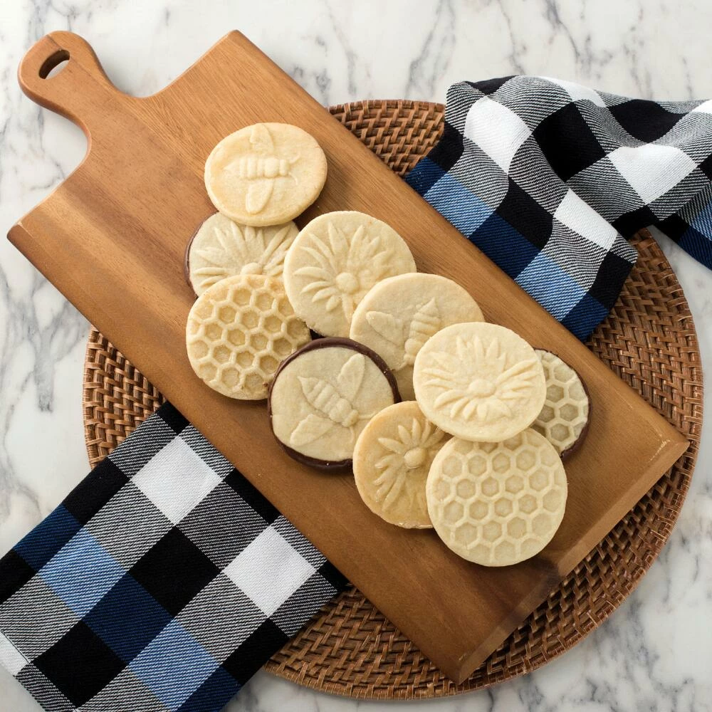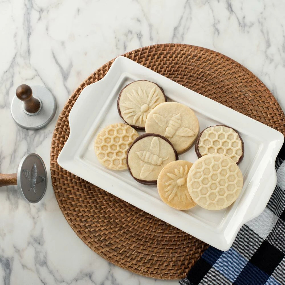 Created by the baking experts at Nordic Ware, these buzzworthy cookie stamps decorate your cookie dough with vintage-inspired patterns celebrating the honey bee. A set of three cast-aluminum stamps with wooden handles, they feature sweet bee, beehive and honeycomb designs that make cookies look amazing without frosting. Family-owned since 1946, Nordic Ware is world famous for their traditional Scandinavian-style bakeware and baking tools.