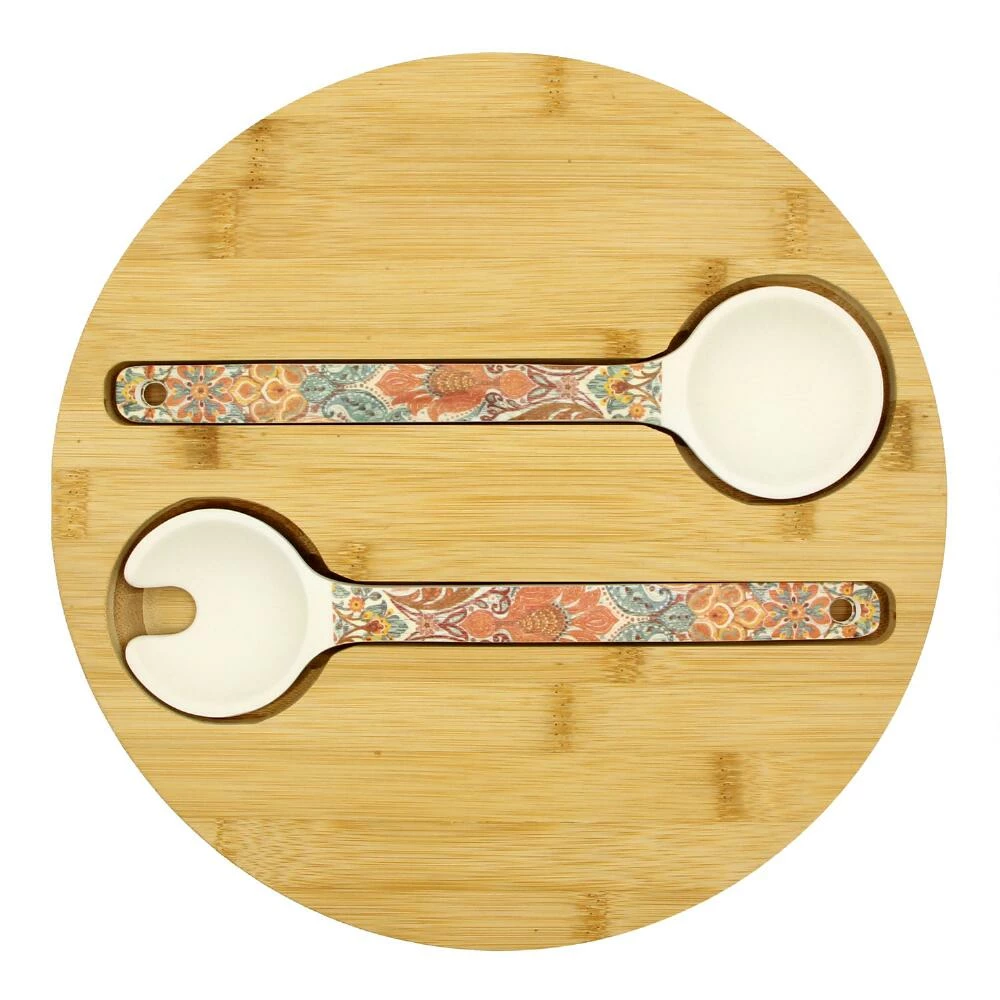 Crafted of bamboo fiber and melamine with a multicolor paisley design, our exclusive serving bowl includes two salad servers that store in the rustic lid. A space-saving set for apartments and small kitchens, the large bowl and utensils are perfect for preparing, tossing and serving a full salad or side. Simply top the bowl with the natural bamboo lid to store any leftovers in the fridge.