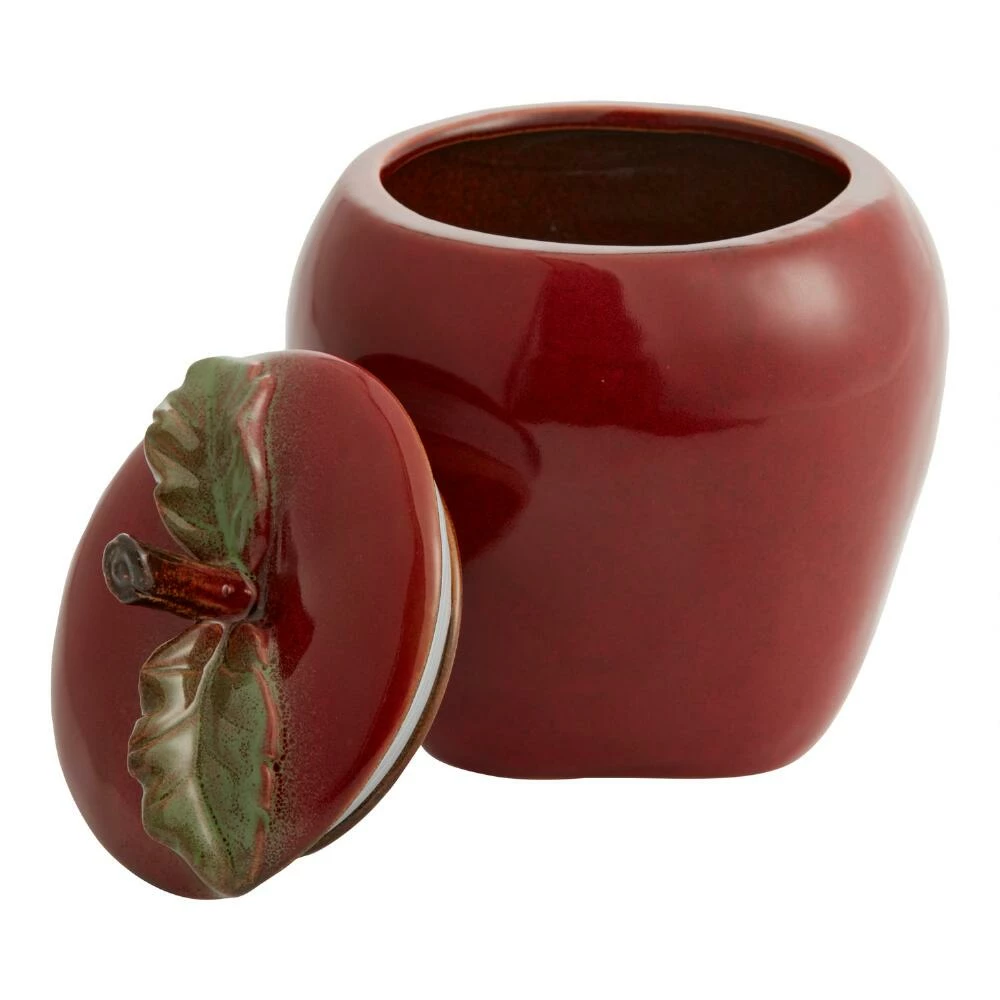 Shaped like an apple with a delicious red hue, our exclusive storage canister is topped with an airtight lid featuring a stem handle to complete the design. A useful storage container for dry foods and cooking or baking ingredients, its charming look and lovely colors add a fresh fall beauty to the kitchen counter.