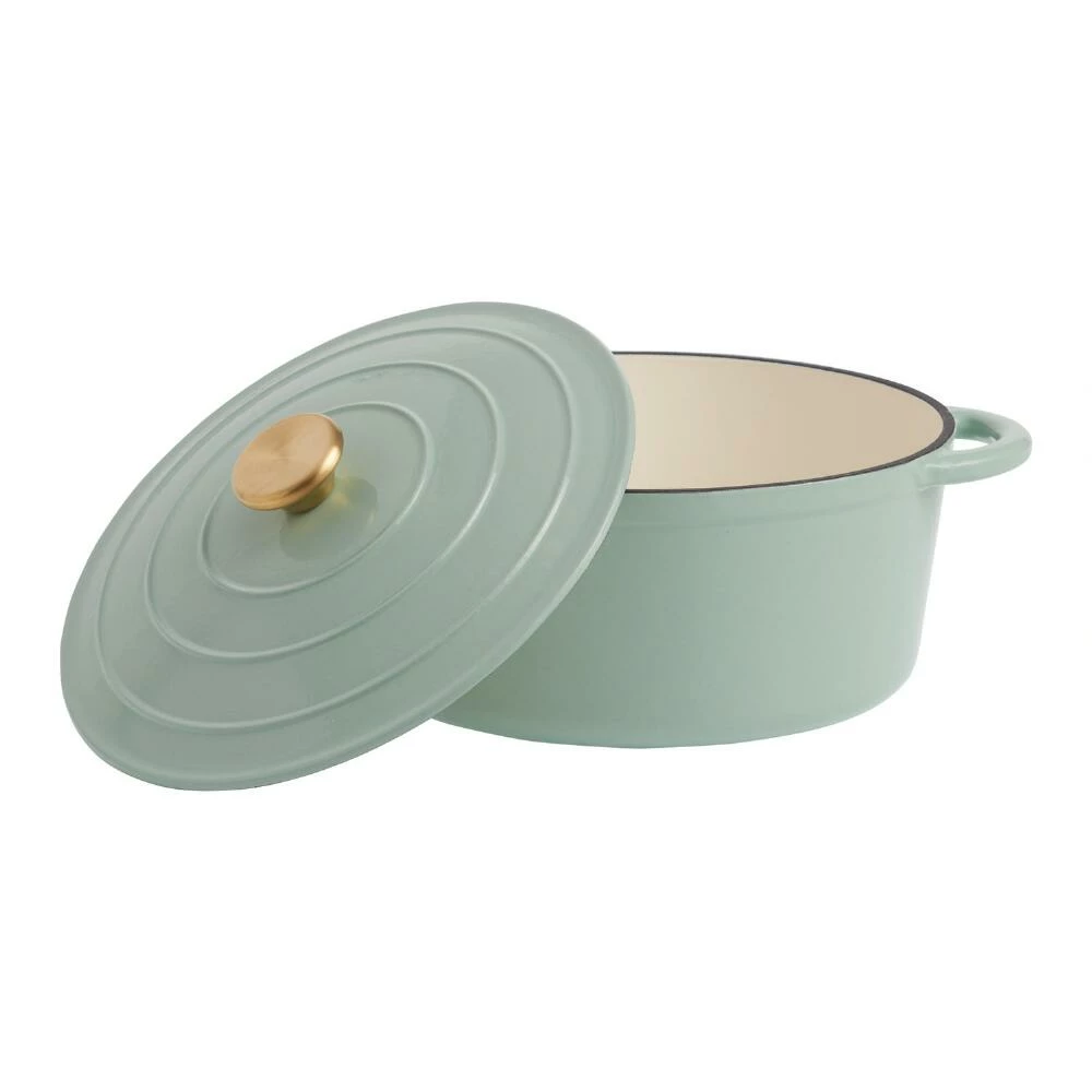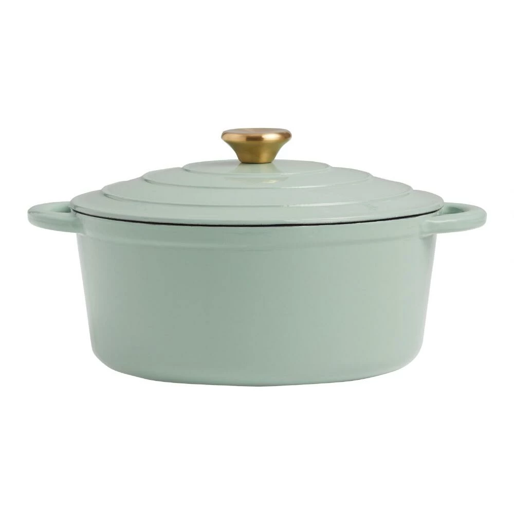 Made of fast-heating cast iron in soft sage green with a self-basting lid, our round Dutch oven features a smooth enamel interior that simmers and braises roasts and one-pot meals to perfection. This exclusive 5-quart baker combines the benefits of cast-iron cooking celebrated by home chefs with an easy-clean enamel finish that prevents sticking and makes cleanup a snap. Its lovely hue makes it perfect for oven-to-table presentations.