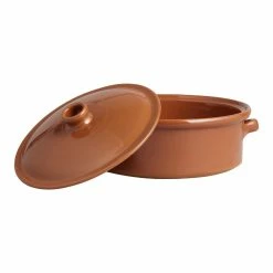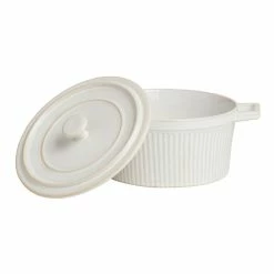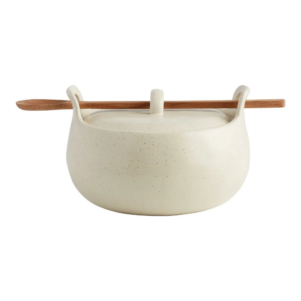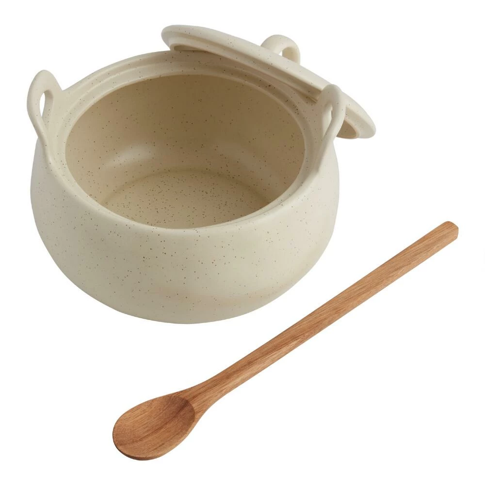 Crafted of stoneware with a light speckled finish that gives it a chic handmade vibe, our medium round baking dish includes a long wood spoon that slots neatly into the notched lid. With its splendid look and built-in serving utensil, this exclusive baker is perfect for unveiling at potlucks and oven-to-table presentations at home.