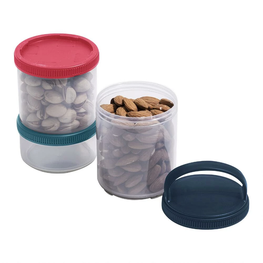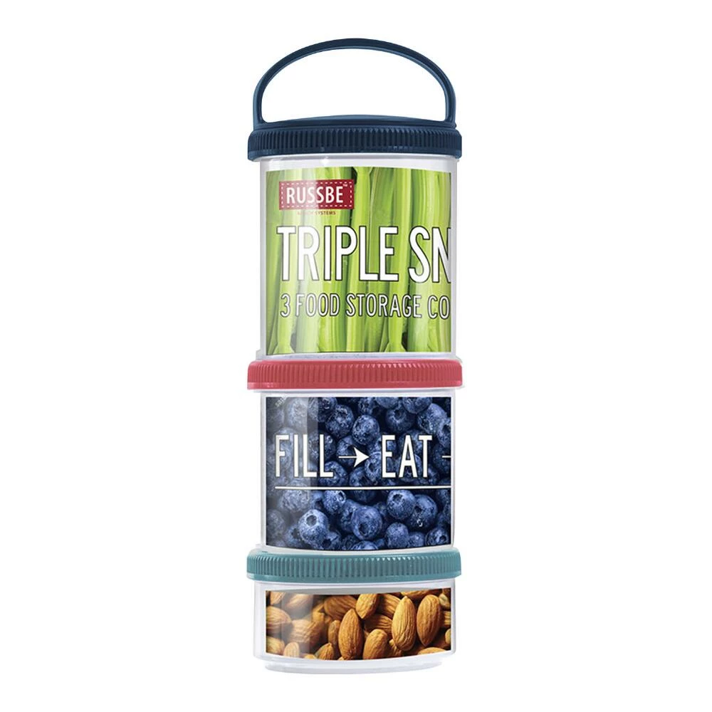 This bento-style snack set includes three assorted containers with interchangeable lids that lock together into a sleek transportable snack stack with a carrying handle. The three container sizes help manage portions, keeping dry snacks, fruits, vegetables and other foods fresh under airtight lids until it’s time to eat. Durable, BPA-free and easy to clean, each container can be used separately or stacked together to save space on the go.