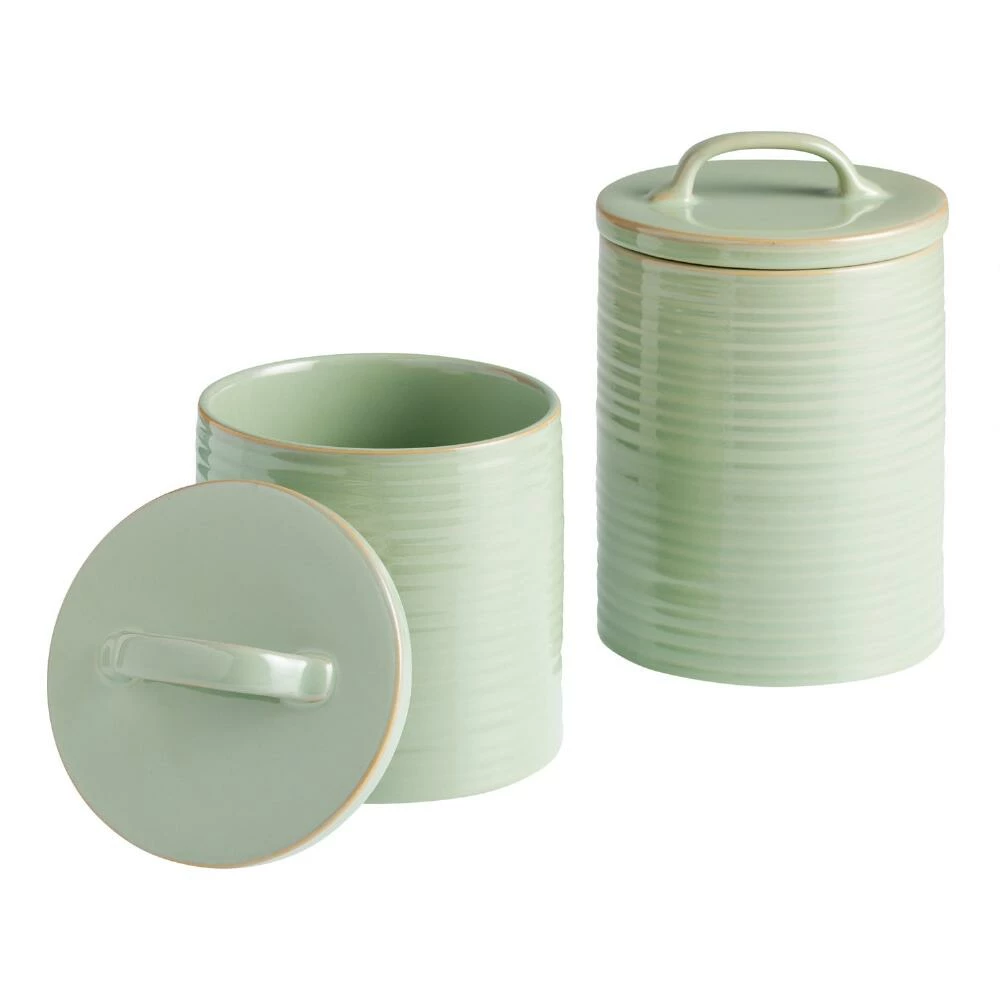 This ceramic storage canister features a classic cylindrical silhouette with retro horizontal ribbing in our incredibly popular sage-green color. Available in two coordinating sizes for storing medium to large amounts of dry goods or cooking ingredients, this lush and soothing kitchen storage keeps its contents fresh under an airtight handled lid.
