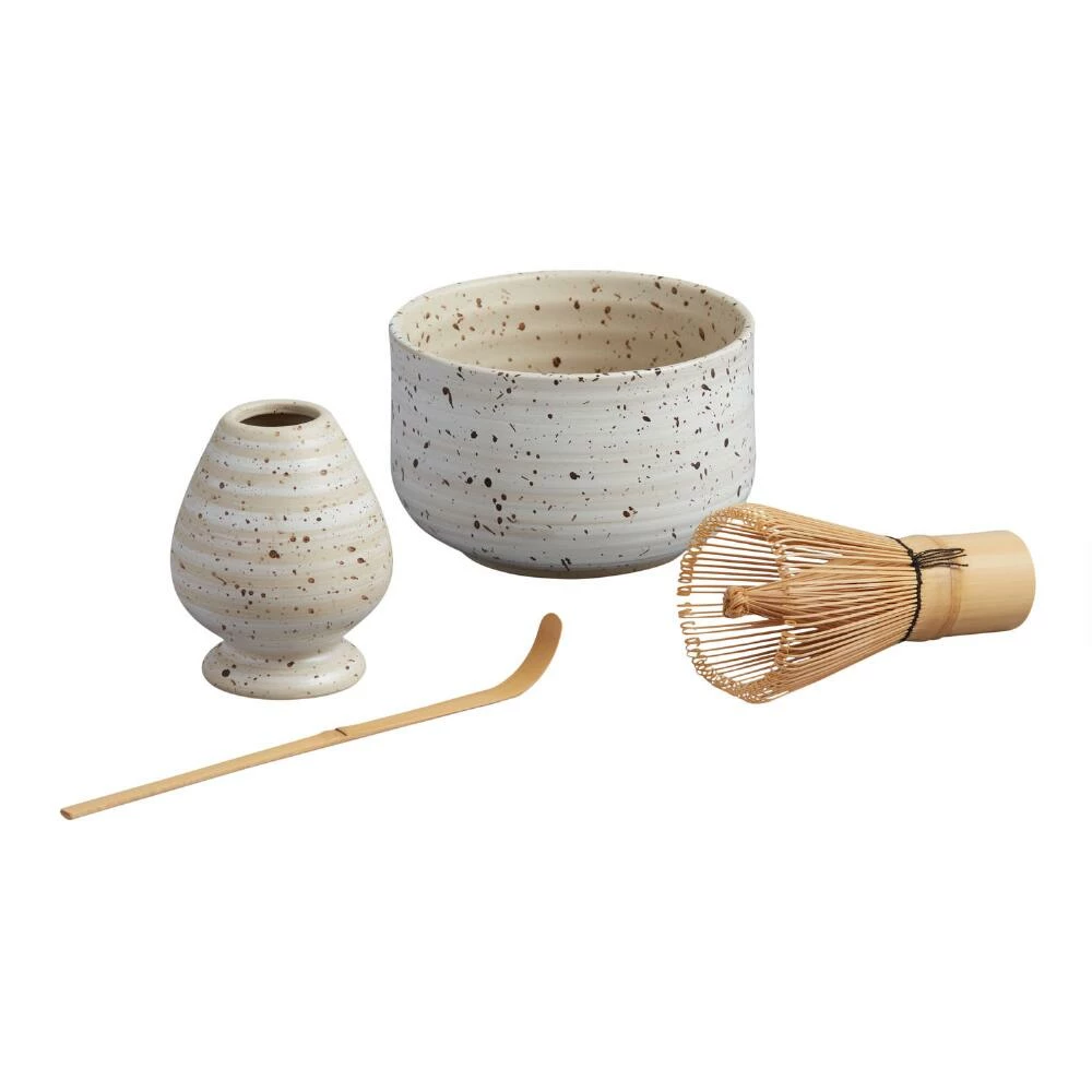 A perfect starter set for one of the hottest trends in tea, this authentic matcha gift set includes a white speckled ceramic chawan bowl, a bamboo chasen whisk, a whisk holder, a bamboo tea scoop and detailed preparation instructions. The Zen-like experience of making matcha tea is part of the fun, and our gift set makes it easy for you or the lucky recipient to try for yourself.