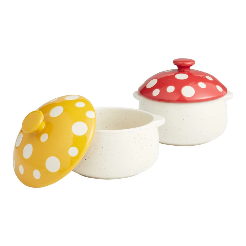 Crafted of stoneware with speckled finishes, our exclusive soup crocks charm with whimsical mushroom-top lids. Perfect for kitchen-to-table serving with two petite handles, their white-spotted mushroom lids keep soups and stews warm until they’re ready to unveil.