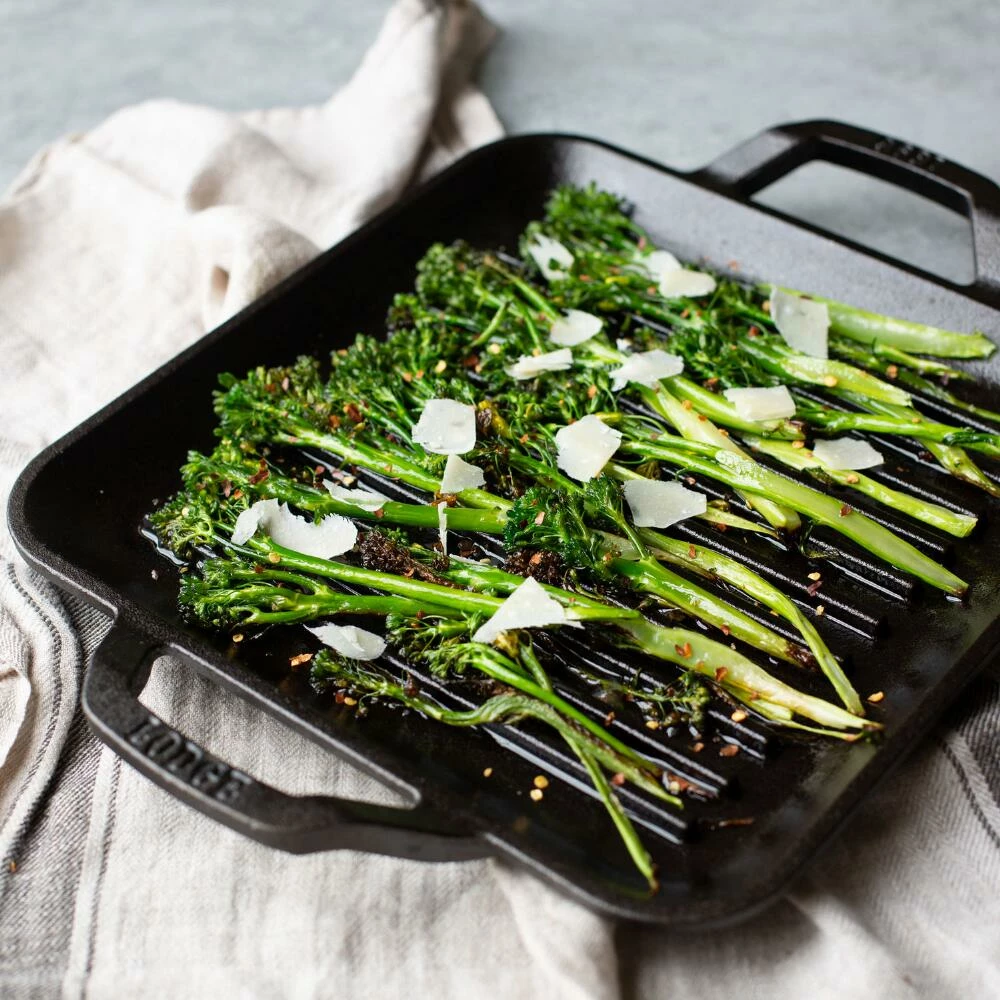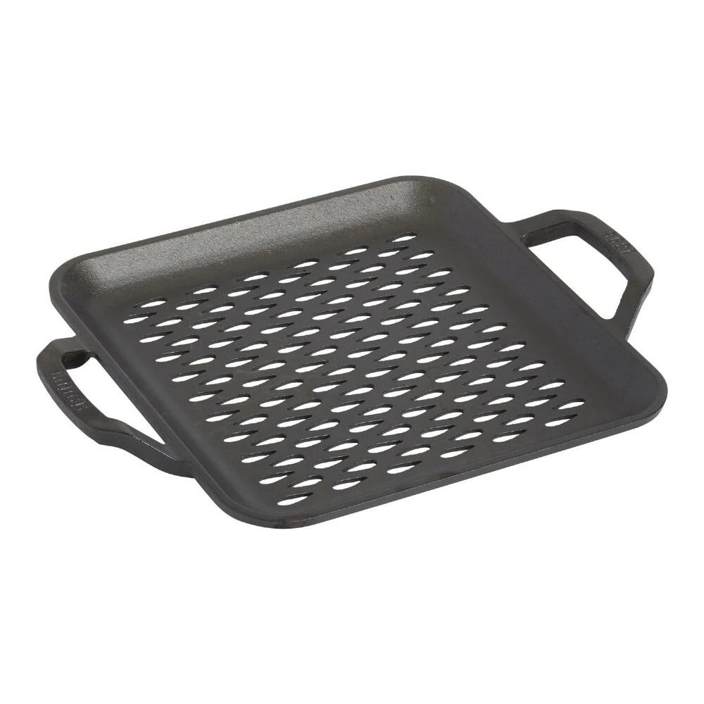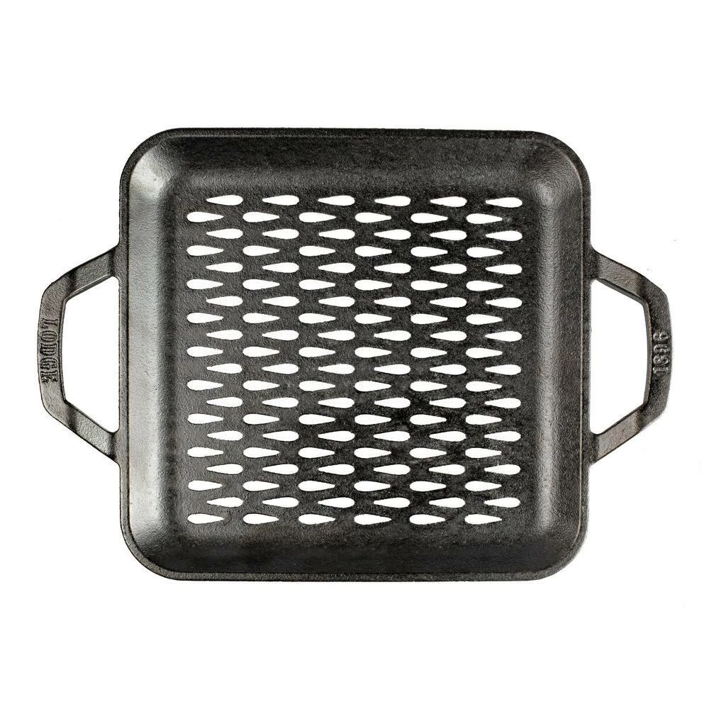 Crafted of preseasoned cast iron with iconic Lodge teardrop cutouts, this square grid adds smoky grill marks to meats, fish seafood and more. Perfect for cooking smaller foods like shrimp and vegetables that would fall through grill slats, it features sloping sides for easy flipping and raised handles for secure transport. With superior heat retention and lasting durability, it’s the ultimate accessory for grilling at home and on the go.