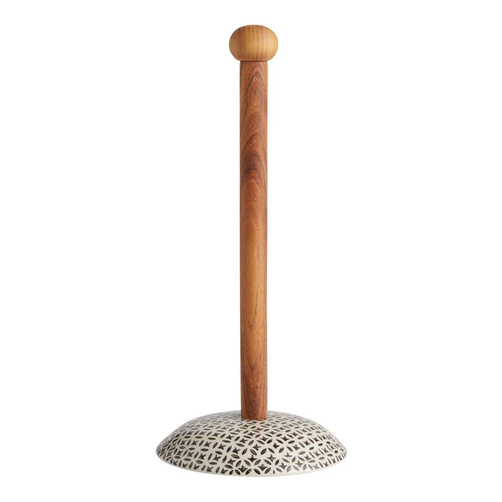 Featuring a base stamped with an exquisite black geometric design, our ivory stoneware and wood paper towel holder adds a beautiful new look to the kitchen. This sophisticated countertop accessory elevates your kitchen decor while keeping your roll of paper towels at the ready.