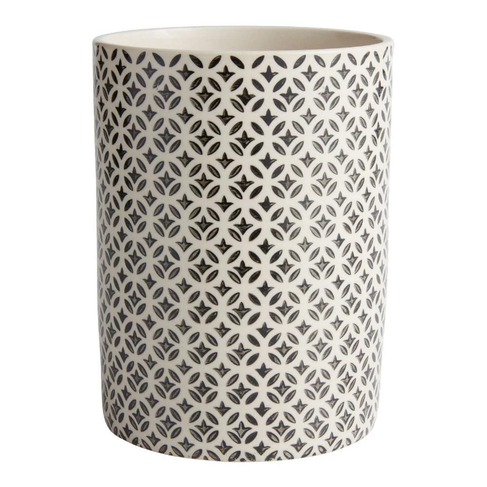 Stamped with an exquisite black geometric design, our exclusive ivory stoneware utensil holder adds a beautiful new look to the kitchen counter. This sophisticated tool crock elevates your kitchen decor while organizing your cooking spoons, spatulas and other large utensils.