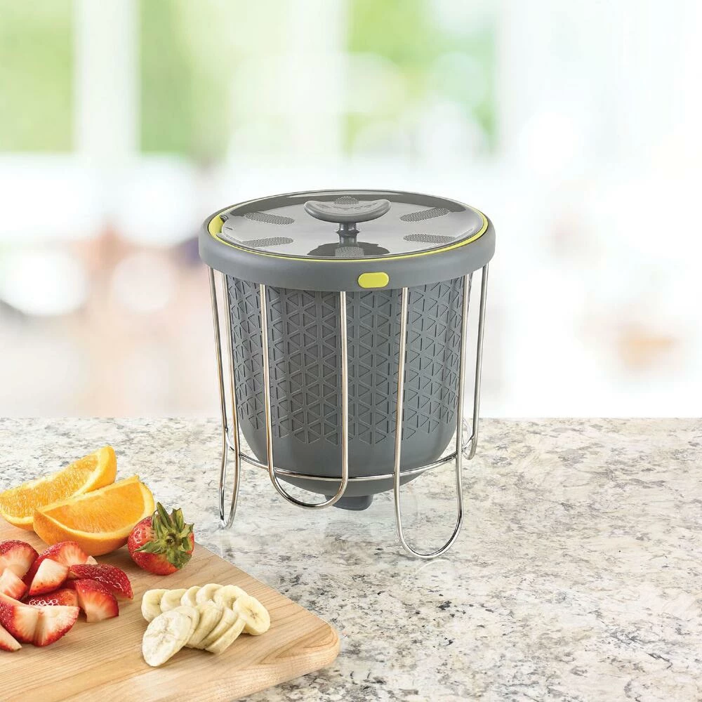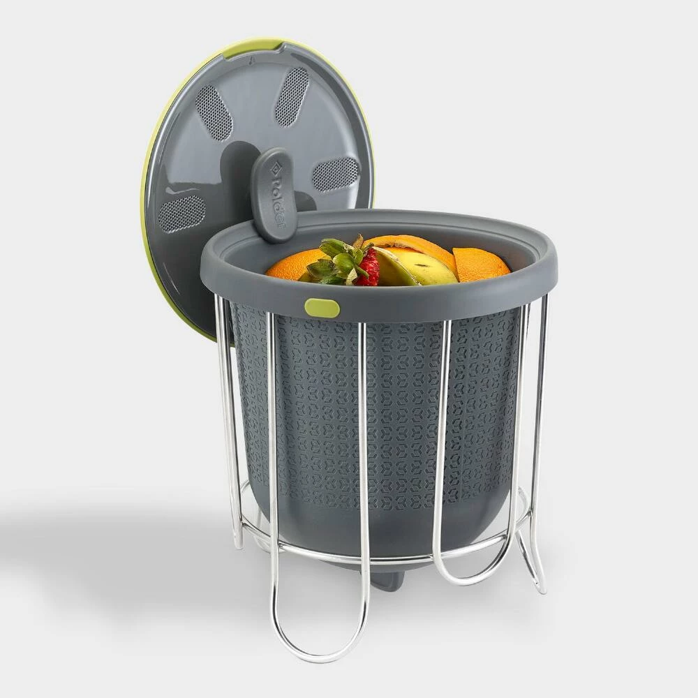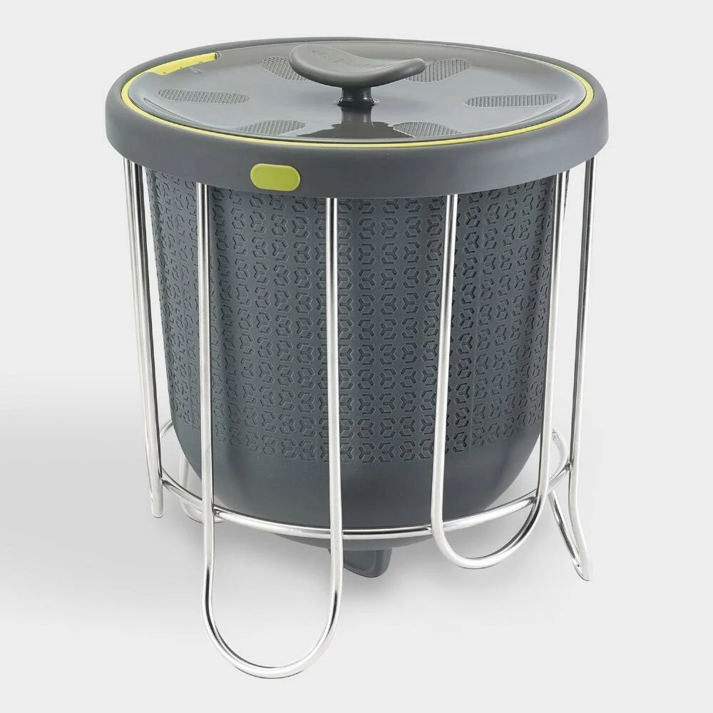 Crafted with a steel frame and a silicone waste bin that inverts for easy emptying, kitchen composting has never been so easy or fashionable. This compost bin safely stores everything from vegetable waste to coffee grounds, and the lid rotates to control air flow and odor. Empty the scraps into your outdoor composter to create nourishment your plants will love!