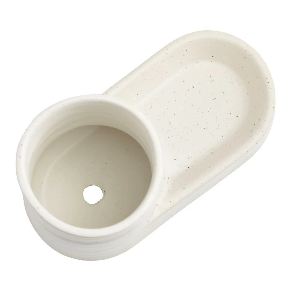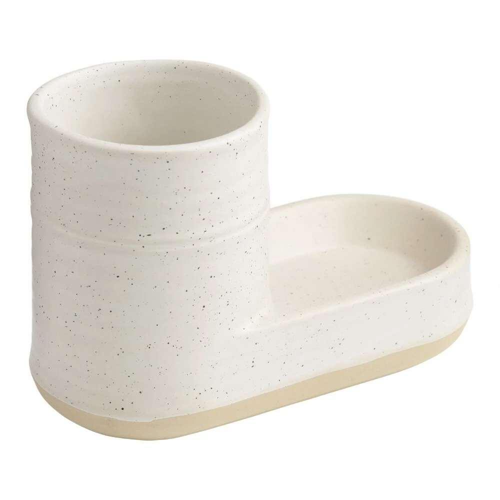 Crafted of ivory stoneware, the Tipton farmhouse sink organizer features a speckled finish, an exposed-clay base and the ribbed texture of artisan pottery. Its compact design is streamlined for small sink counters with a raised round brush holder and a connected tray for a soap bottle or sponge.