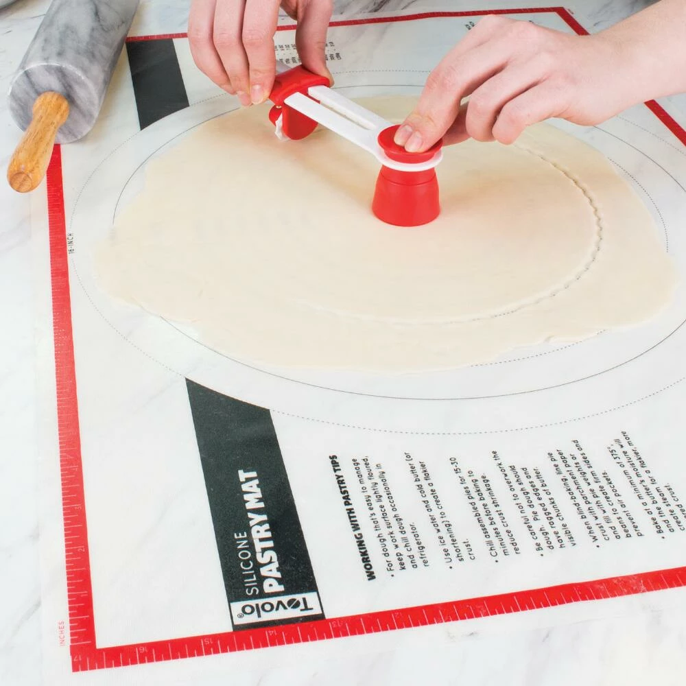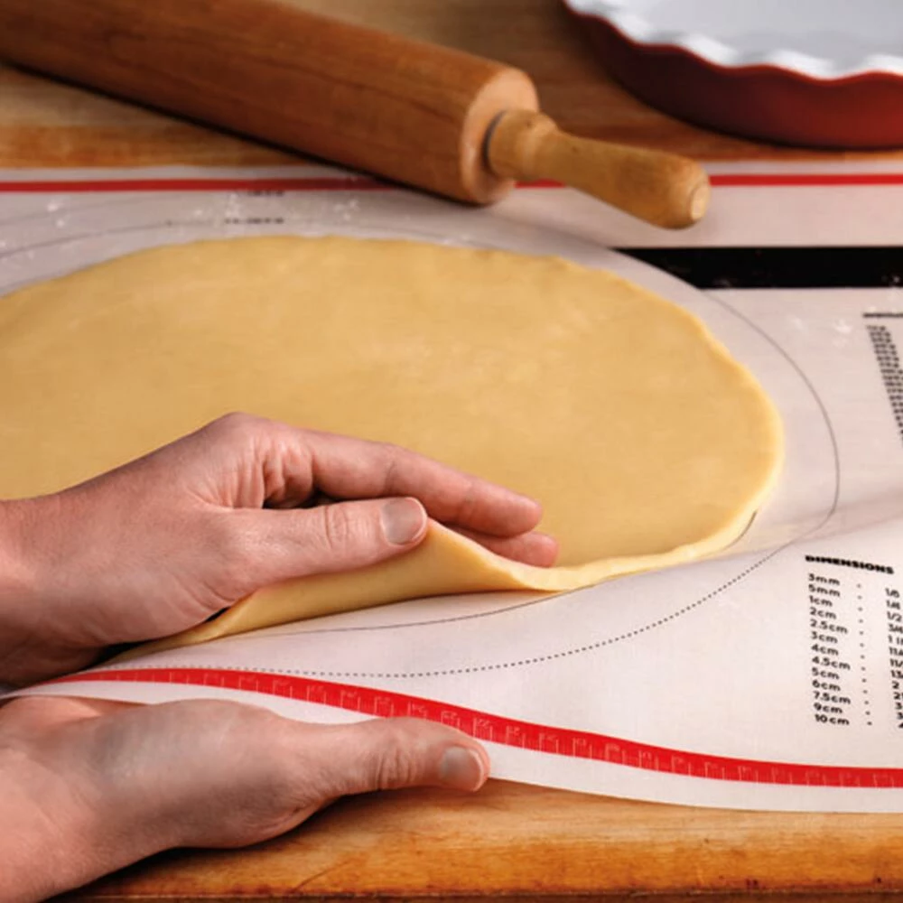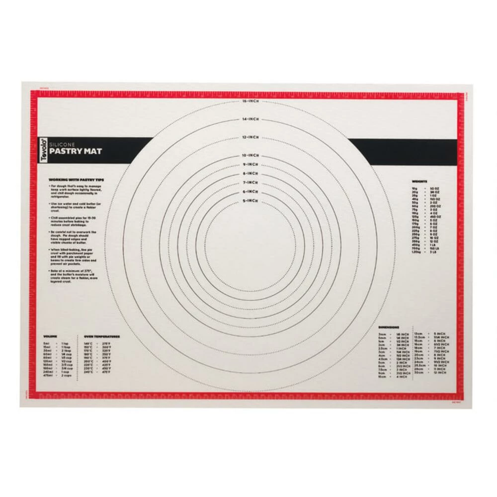 A baker’s essential, this nonstick silicone pastry mat features dough diameters, weight, volume, temperature and dimension conversions plus important tips. It provides a spacious, tear-resistant surface for working with rolling pins and pie dough cutters, and it’s heat-resistant for use as a nonstick baking mat.