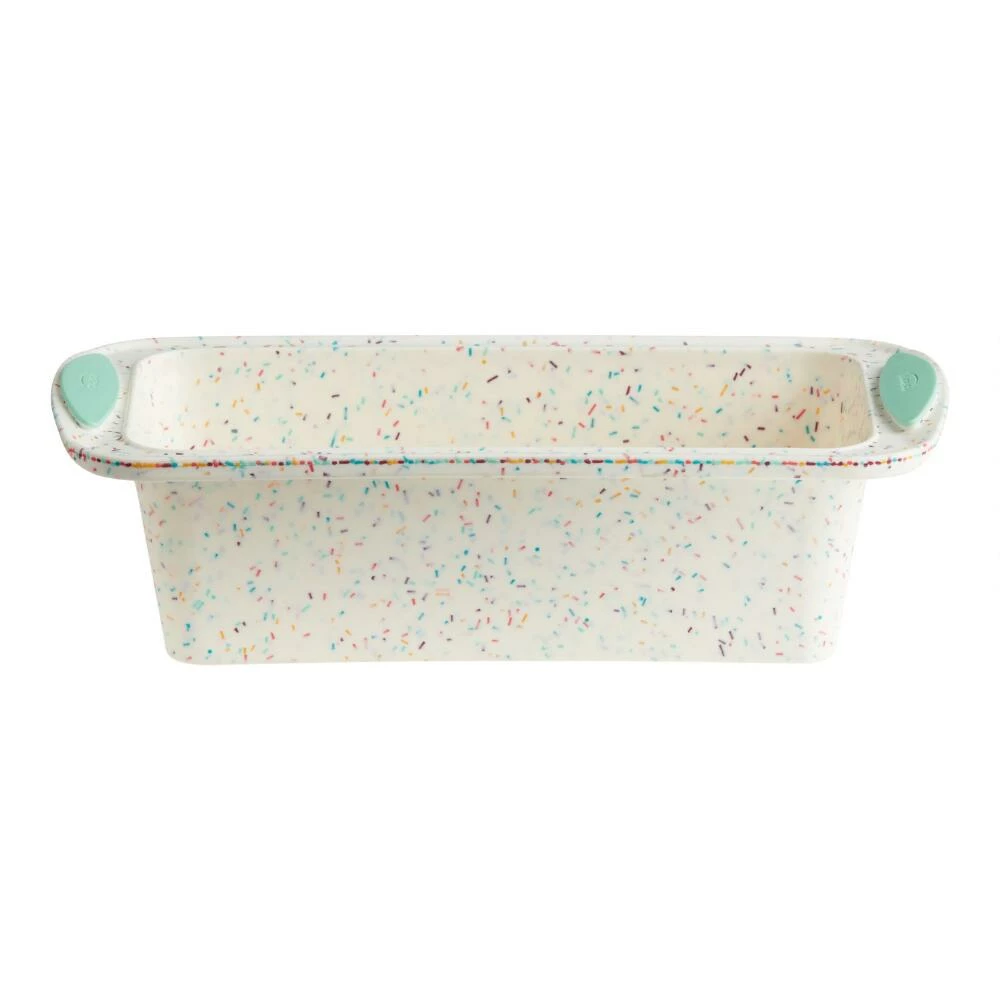 Made of silicone with a colorful confetti design, this Trudeau loaf pan features an integrated steel rim that keeps it firmly structured. Its naturally nonstick silicone interior bakes perfectly browned loaves of banana, zucchini and other homemade quick breads that release easily every time. The stabilizing metal structure of this reliable baking pan prevents it from collapsing in the oven or wobbling on the tabletop.