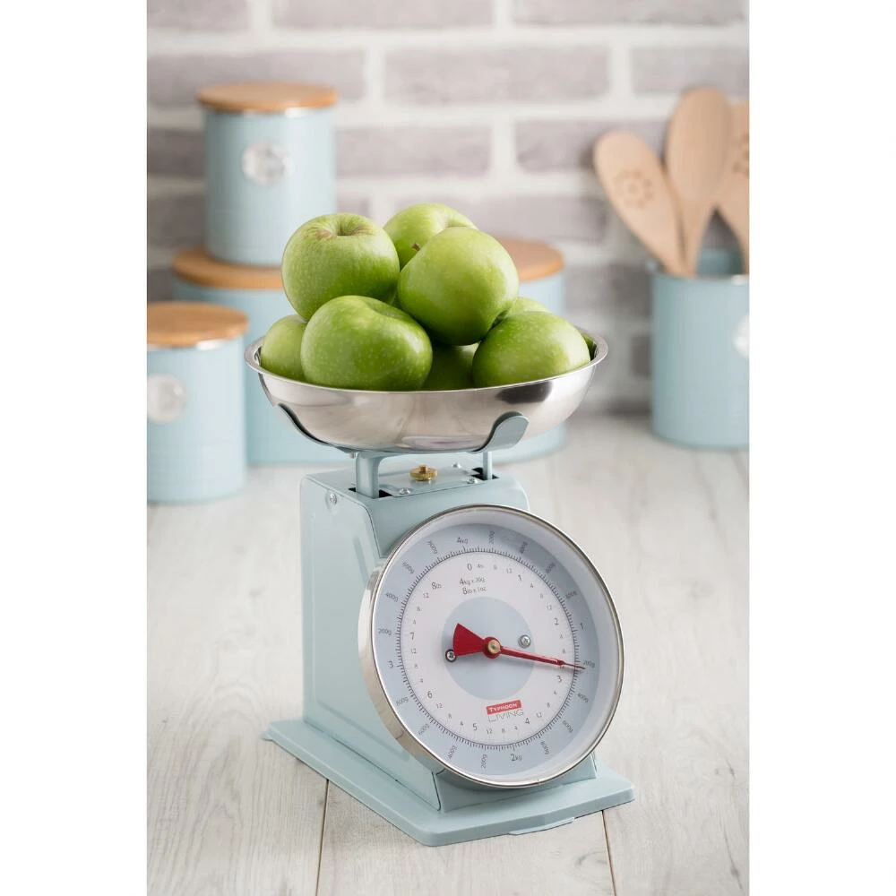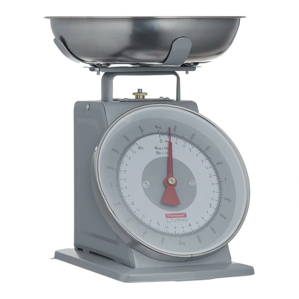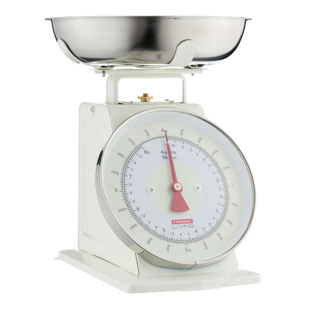 Crafted of stainless steel with a coated finish, this Typhoon Living kitchen scale features an easy-to-read analog dial and a large weighing bowl. This precision food scale weighs accurately up to eight full pounds and is marked with grams, kilograms and ounces for baking and cooking recipes. Known for their high-quality kitchenware since 1994, Typhoon makes attractive and practical essentials with a long-lasting durability.