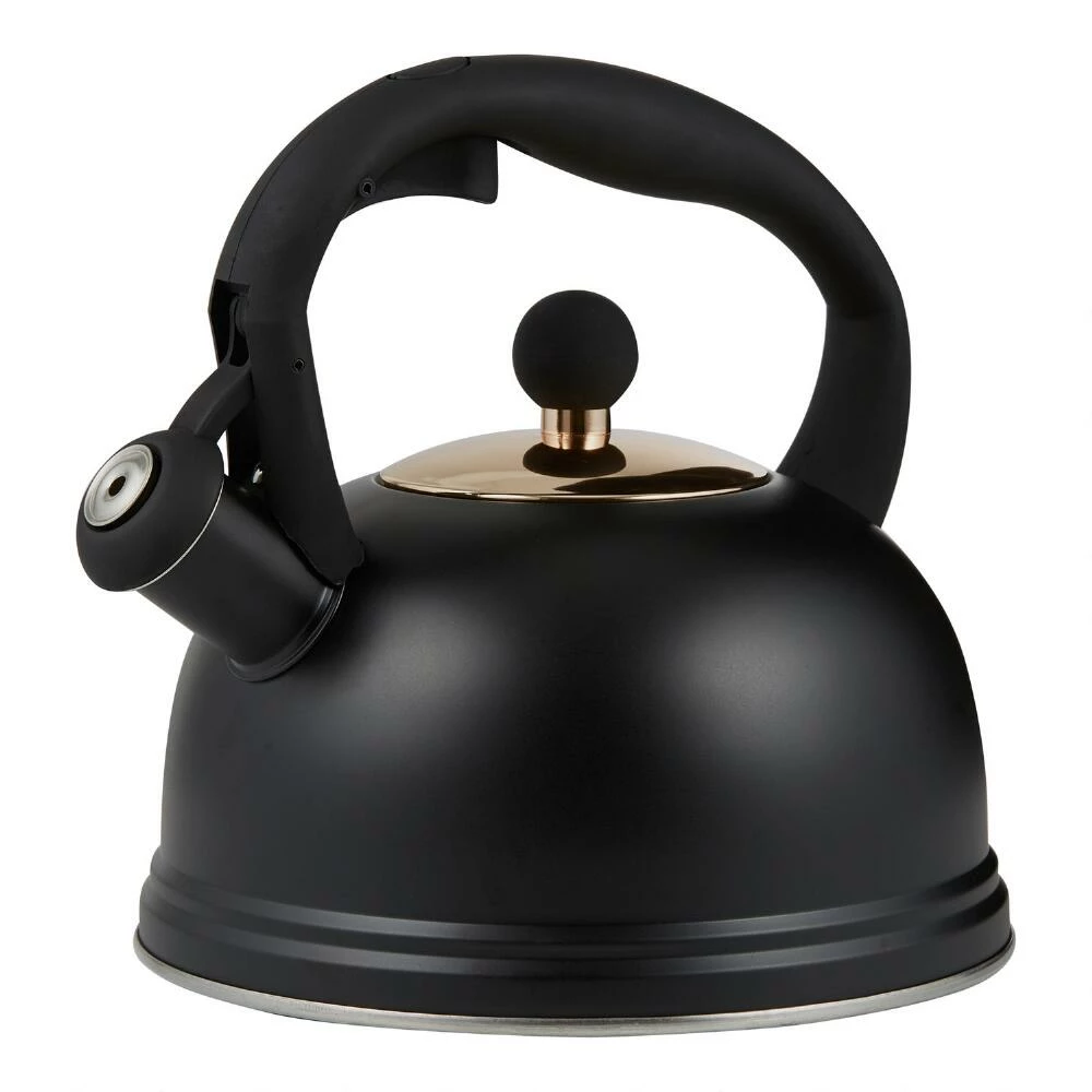 Crafted of stainless steel with a ribbed base in matte black and a gold lid, this Typhoon Otto stovetop kettle features a classic whistling spout. A sophisticated gift for coffee and tea lovers, its wide base absorbs heat for quick boiling and its soft-touch handle makes for effortless pouring at teatime. Known for their high-quality kitchenware since 1994, Typhoon makes attractive and practical essentials with a long-lasting durability.