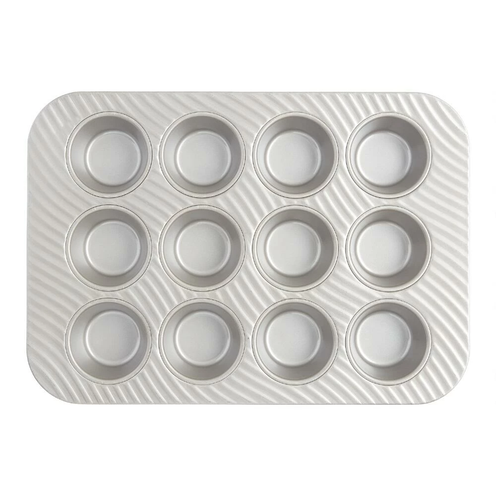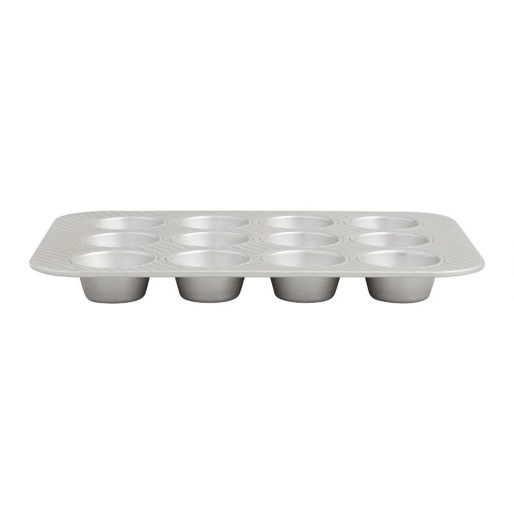 Crafted by family-owned USA Pan® of partially-recycled aluminized steel, this 12-cup muffin pan is coated with nonstick silicone for an easy release. Featuring a warp-resistant ridged surface that resembles a waving flag, this unique pan increases airflow for quicker, more even baking and browning. Durable and fast heating, it’s perfect for baking a dozen of your favorite cupcakes or muffins.