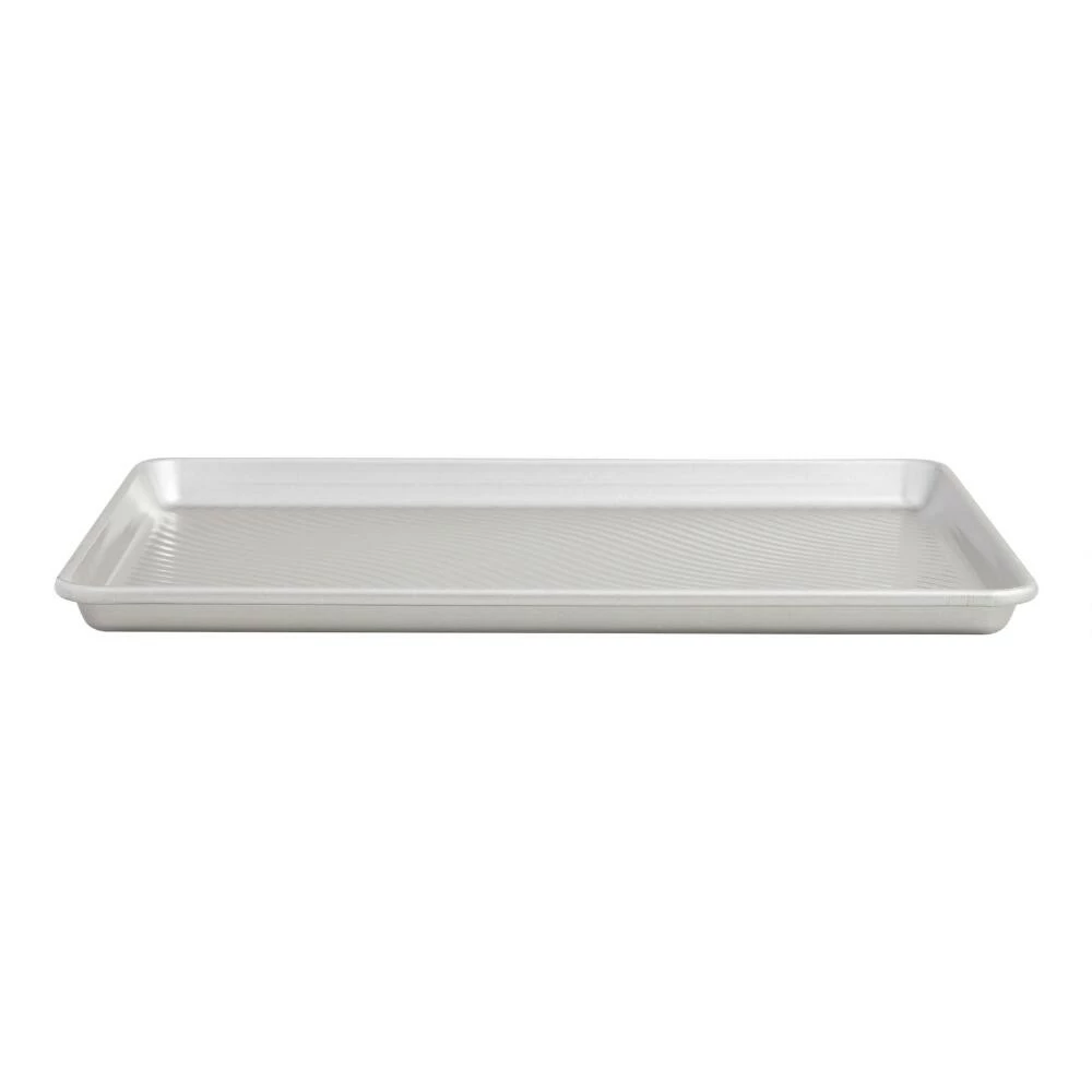 Crafted by family-owned USA Pan® of partially-recycled aluminized steel, this half-sheet baking pan is coated with nonstick silicone for an easy release. Featuring a warp-resistant ridged surface that resembles a waving flag, this unique sheet pan increases airflow for quicker, more even baking and browning. Keep this reliable oven workhorse on hand to bake and roast meats, poultry, vegetables, French fries, cookies, pizzas and more.