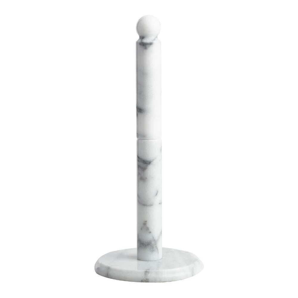 Handmade of white marble with classic gray veining, our exclusive paper towel stand is a sophisticated addition to your kitchen decor. A substantial, naturally weighted piece, it has subtle variations in the veining pattern making each one unique.