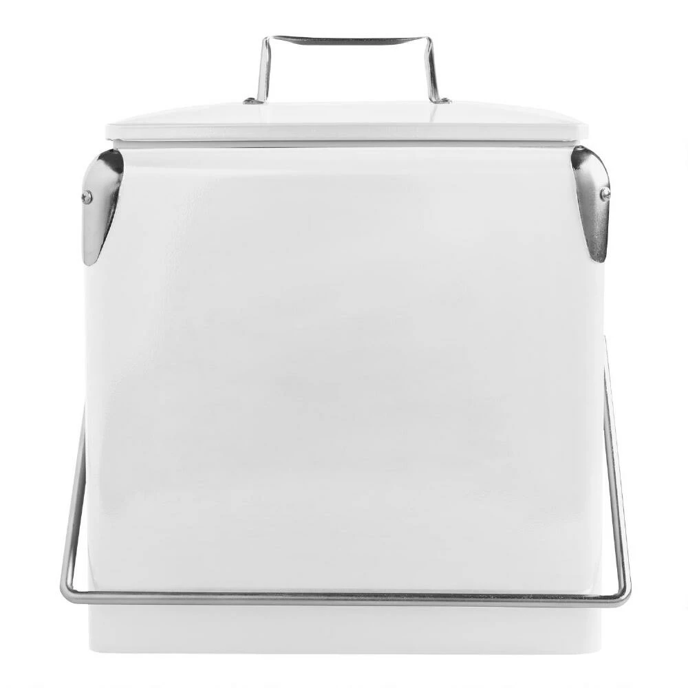 Made of steel with a powder-coated white finish and chrome details, our retro-style beverage cooler keeps up to 18 cans or 12 bottles cold and ready to drink. Perfect for parties indoors or out, this easily transportable cooler features a locking lid with a carrying handle and a convenient bottle opener on the side.